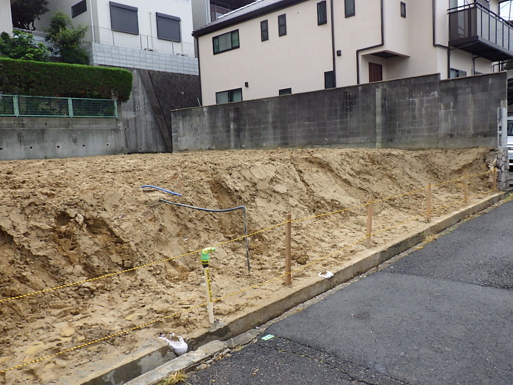 敷地が前面道路より高かったため、掘削工事を行い、ブロックで土留めを施工して駐車場部分の高さを下げ、道路とフラットに仕上げました。
